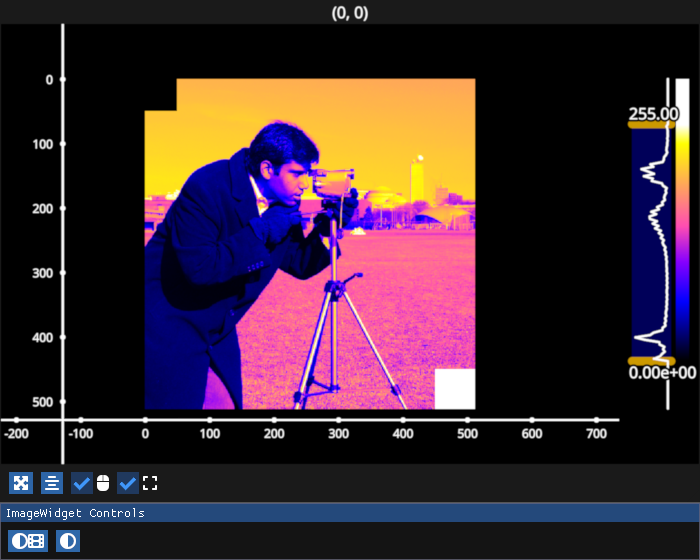 Every image in an ImageWidget is associated with an interactive Histogram LUT tool and colorbar. Right-click the colorbar to pick colormaps.